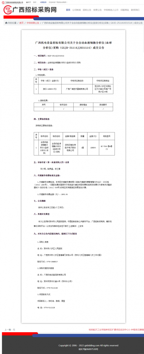全自动血液细胞分析仪(血球分析仪)采购成交公告