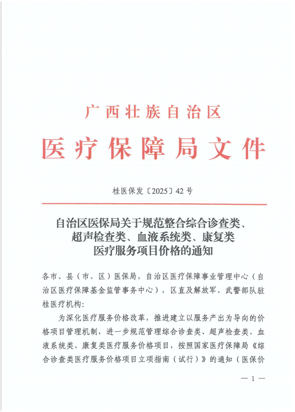 转发《自治区医保局关于规范整合综合诊查类、 超声检查类、血液系统类、康复类 医疗服务项目价格的通知》(桂医保发〔2025〕42号)