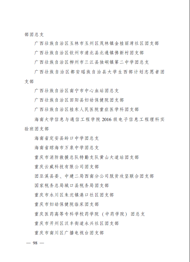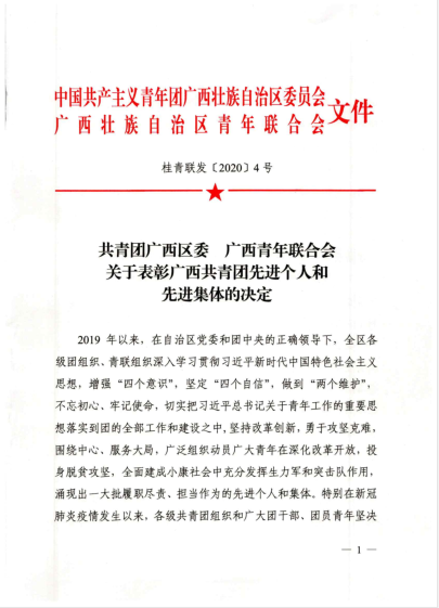 为表彰先进,宣传先进,激励全国团员、团干部和各级团组织奋发有为、再创佳绩,今天,共青团中央发文(中青发〔2020〕8号)表彰了一批全国优秀共青团员、共青团干部和全国五四红旗团组织。其中,广西桂东人民医院重症医学科团支部荣获“全国五四红旗团支部(团总支)”称号!此称号是团中央授予基层团支部的最高荣誉。这是广西桂东人民医院第一次获得共青团系统内的最高荣誉,奋斗正当时,青年有担当。这份荣誉不仅是对医院重症医学科团支部工作的高度认可,是重症医学科团员青年收到的最好的节日祝福,更是对全体桂东青年投身岗位的激励和鞭策。荣誉的取得离不开各级党团组织的关心和指导,离不开医院坚持党建带团建的坚强领导,更是每一位桂东青年践行“团结奉献 奋发图强”医院精神的共同成果。