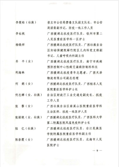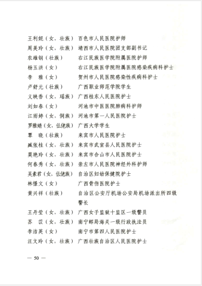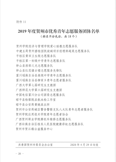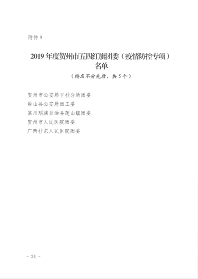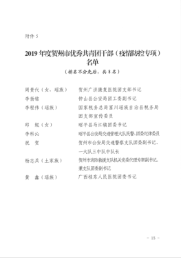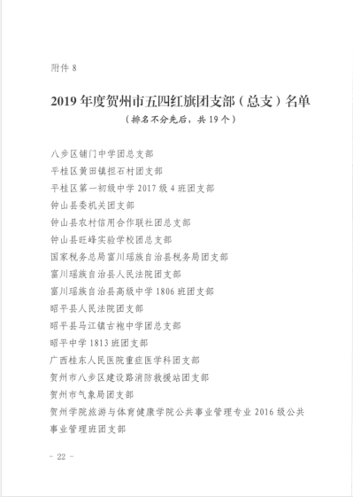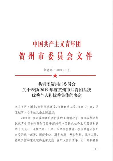 同时,在五四前夕,2019年度广西青年五四奖章、广西“两红两优”、贺州市“两红两优”获奖名单相继公布。医院基层团组织、团干部、团员青年共获12项表彰。重症医学科护士长何娟荣获2019年度“广西青年五四奖章(新冠肺炎疫情专项)”,重症医学科护师义映香荣获2019年度“广西优秀共青团员(新冠肺炎疫情专项)”。医院团委荣获2019年度“贺州市五四红旗团委”,重症医学科团支部荣获2019年度“贺州市五四红旗团支部(总支)”,医院团委书记黄鑫荣获2019年度“贺州市优秀共青团干部(新冠肺炎疫情专项)”,李小绿、马勇莲荣获2019年度“贺州市优秀共青团员”,陈远梅荣获2019年度“贺州市优秀共青团员(新冠肺炎疫情专项)”,孔露婕、曾愉、曾晓林荣获“2019年度贺州市优秀青年志愿者”,医院健康彩虹志愿服务队荣获“2019年度贺州市优秀青年志愿服务团体”。新的起点,新的征程。这些荣誉既是对医院团委工作的肯定和鞭策,也是对全院各级团组织和广大团员青年的激励与鼓舞。2020年,我们将继续坚持服务青年、服务发展这个宗旨,努力加强我院团组织建设,引导青年医务工作者勇于担当作为,勇于改革创新,充分发挥青年的生力军作用,以培养具有创新精神和实践能力的青年人才为目标,继续团结带领广大团员青年“不忘初心跟党走”,为推进医院发展作出新贡献。邮箱 | gxgdyy[at]163[dot]com