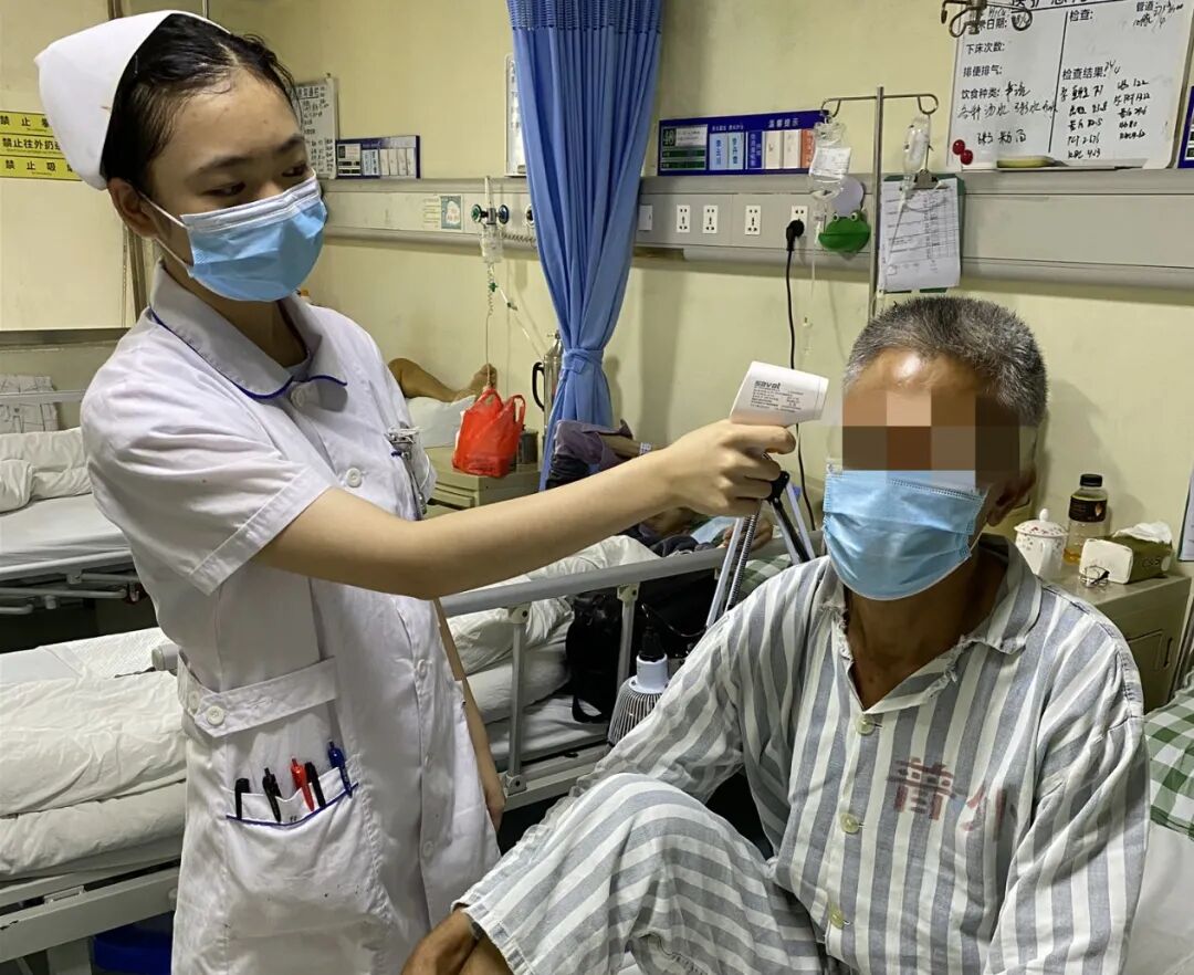 对住院患者及陪护人员,每日由护士进行体温监测、固定陪护人员;严格落实医护人员、患者及家属的个人防护,病房定时开窗通风、环境消毒,并检查督促住院患者、陪护戴口罩,指导陪护人员扫码订餐,减少外出,严格按照防控指南开展医疗工作,充分做好预防工作,守护群众的健康。