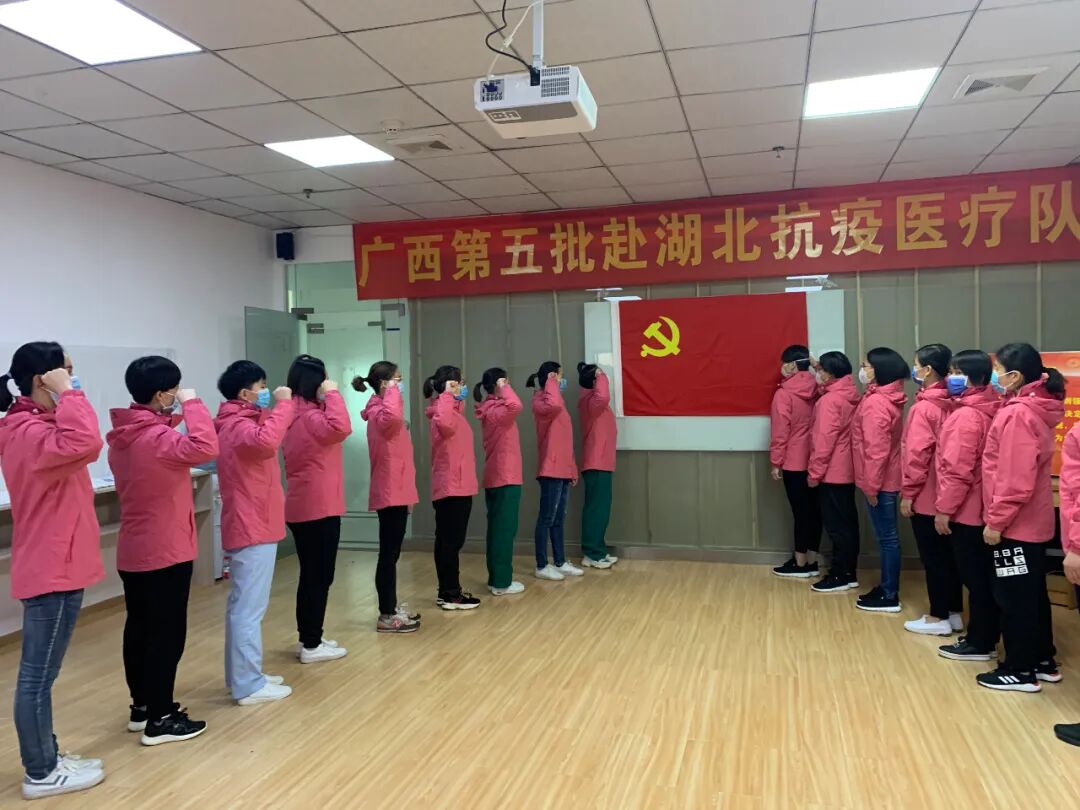 “我志愿加入中国共产党,拥护党的纲领,遵守党的章程,履行党员义务,执行党的决定,严守党的纪律,保守党的秘密,对党忠诚,积极工作,为共产主义奋斗终身,随时准备为党和人民牺牲一切,永不叛党。”在同行党员白衣战士的见证下,由临时党总支部书记庞清同志领誓,包括岑小凤同志在内的22名广西第五批支援湖北医疗队队员面向鲜红的党旗,郑重举起右手,紧握拳头庄严宣誓,用铿锵有力的誓言表达对党的忠诚和为党的事业奋斗终身的坚定决心。