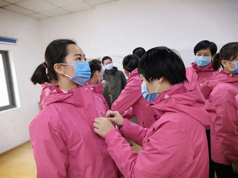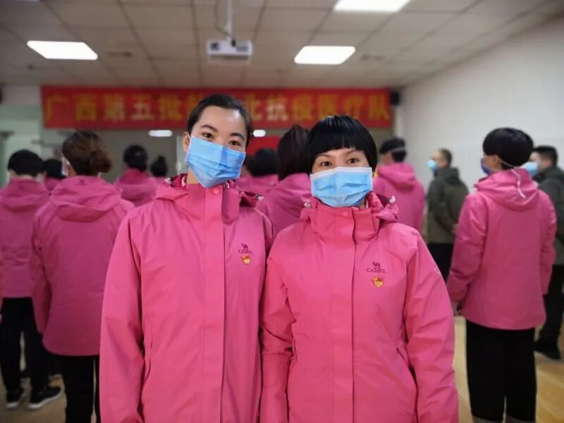 2020年3月14日下午,广西第五批支援湖北医疗队临时总支部在抗疫一线举行集体入党宣誓仪式。宣誓完毕后,老党员、广西桂东人民医院支援湖北医疗队病区护士长、贺州市支援湖北医疗队队长、广西桂东人民医院支援湖北医疗队队长何娟为岑小凤这位新党员佩戴党徽,将红色基因传承下去。
