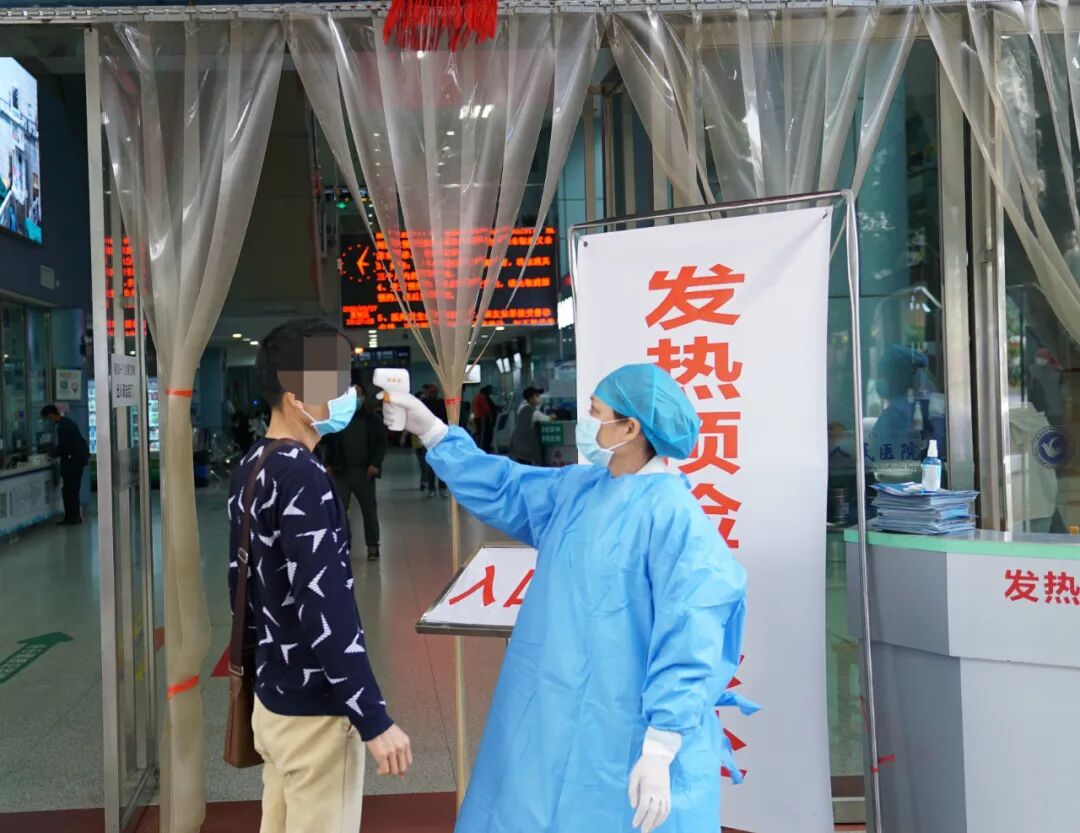 一级防控:医院在预检分诊台对所有进入医院的全体人员(含门诊透析患者及医务人员)使用非接触式电子体温计监测患者体温,要求所有患者和陪护佩戴口罩,并询问接触史,有无呼吸道症状;已住院透析患者由所在病房进行监测。