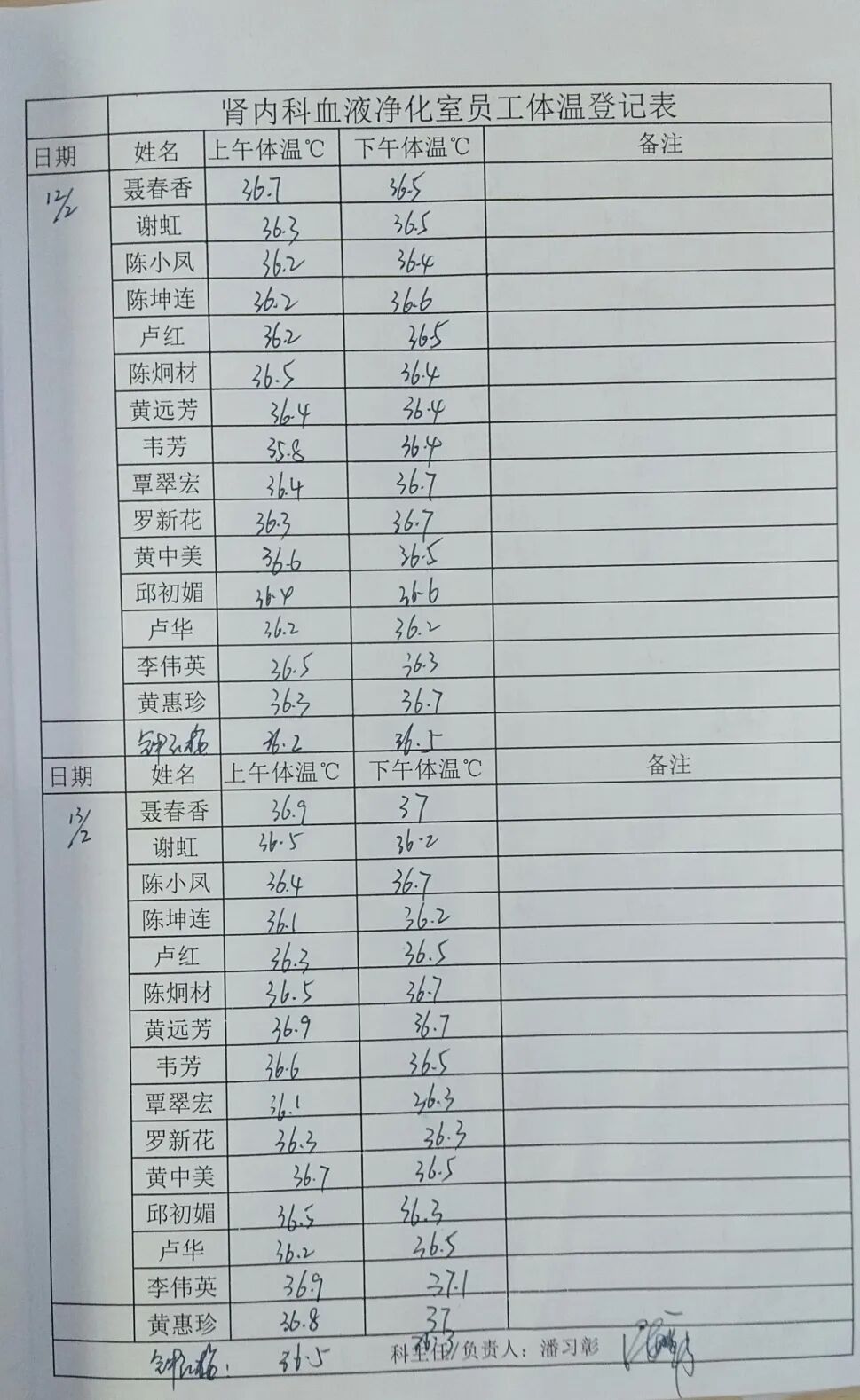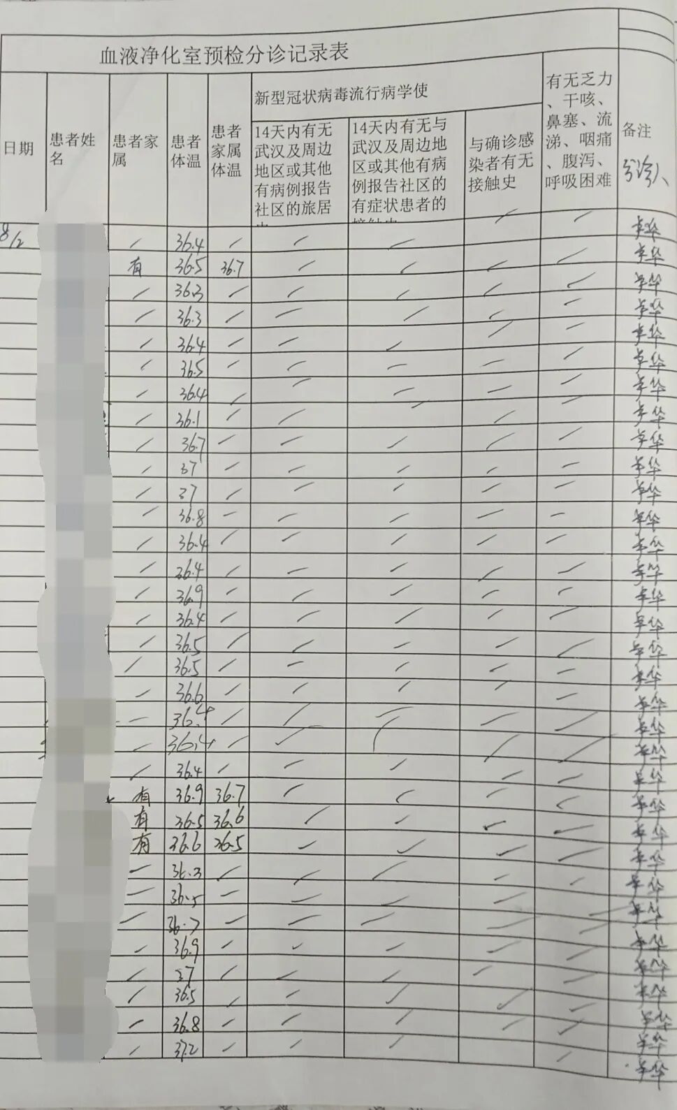 三级防控:责任护士在治疗中密切关注患者体温和病情变化,治疗过程中监测体温并登记于透析记录单。同时加强每日空气及物表消毒频次,每班次之间通风。
