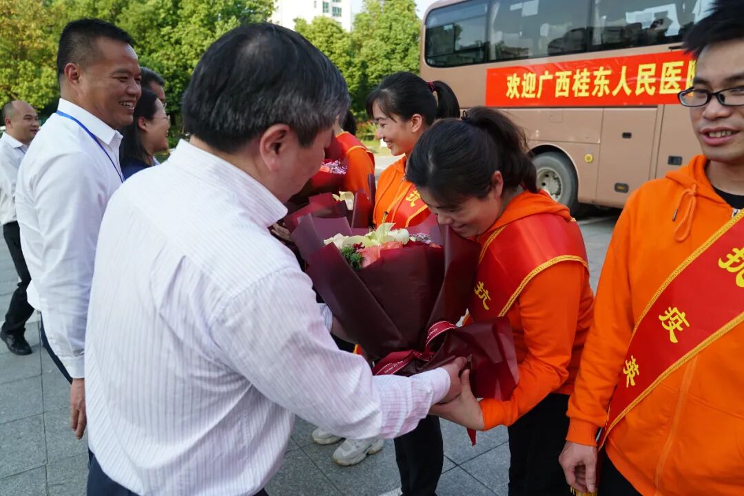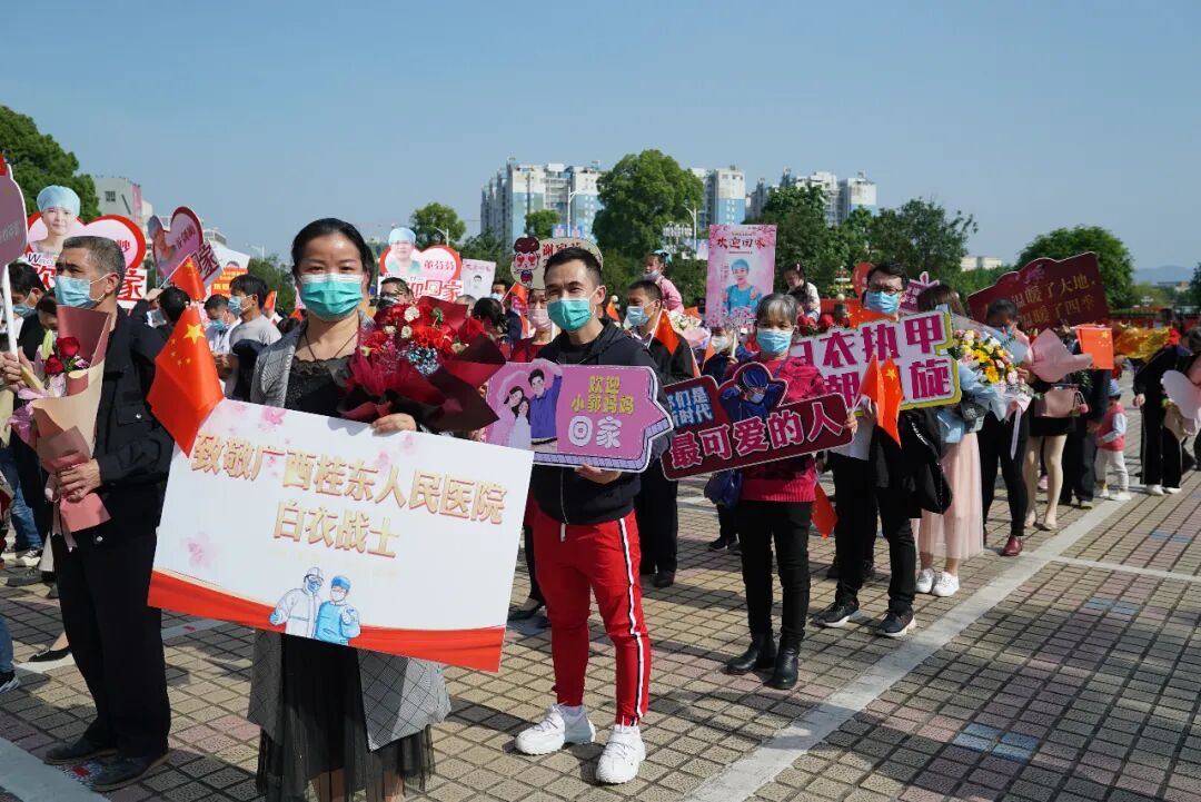 广西桂东人民医院党委书记蒋柳结、党委副书记、院长孔勇、党委委员、副院长曾广吾,带领职能部门、医护人员、医疗队队员亲属等代表早早等候,他们挥舞着国旗,列队迎接久违的援鄂同事,为他们送上最热烈的掌声,向他们致以最崇高的敬意!