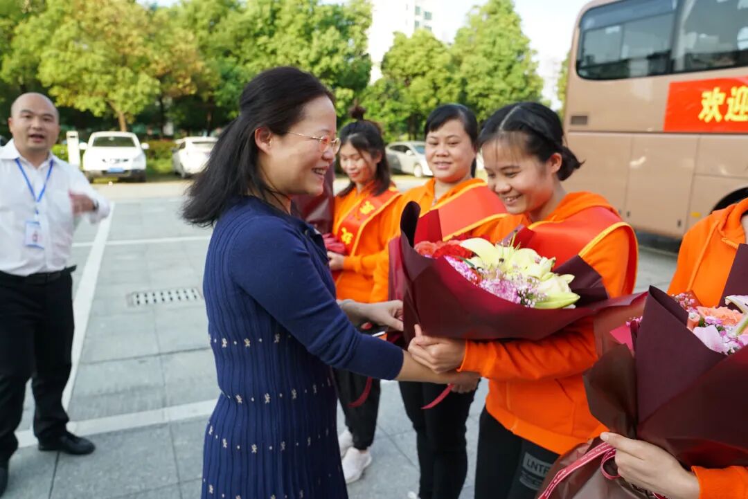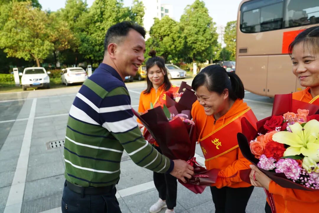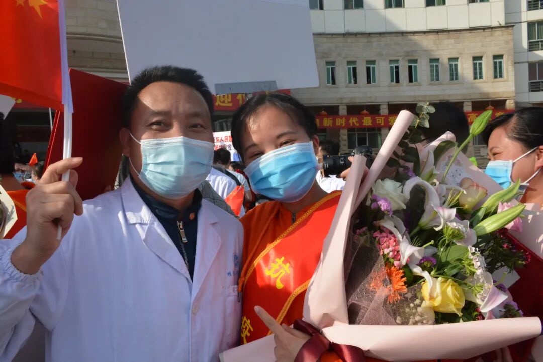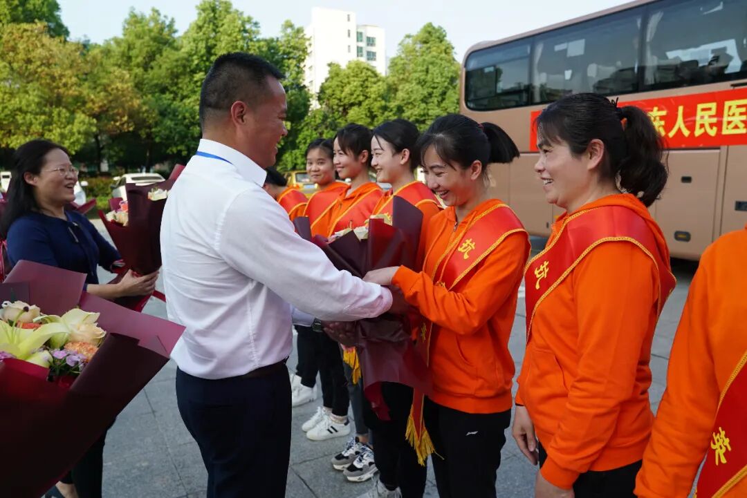 市卫健委副主任翟献全、医院党委书记蒋柳结、党委副书记、院长孔勇、党委委员、副院长曾广吾为援鄂医疗队员们送上鲜花,并传达了市卫健委、医院党委、医院对他们的问候和关切。