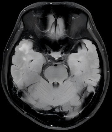 神经内科二科的医生接诊了他。通过详细的问诊和查体,查阅既往资料,医生第一时间为他安排了头颅磁共振复查。影像结果确实显示小杨大脑双侧颞叶存在异常信号,与放射性脑病的影像改变高度相似。