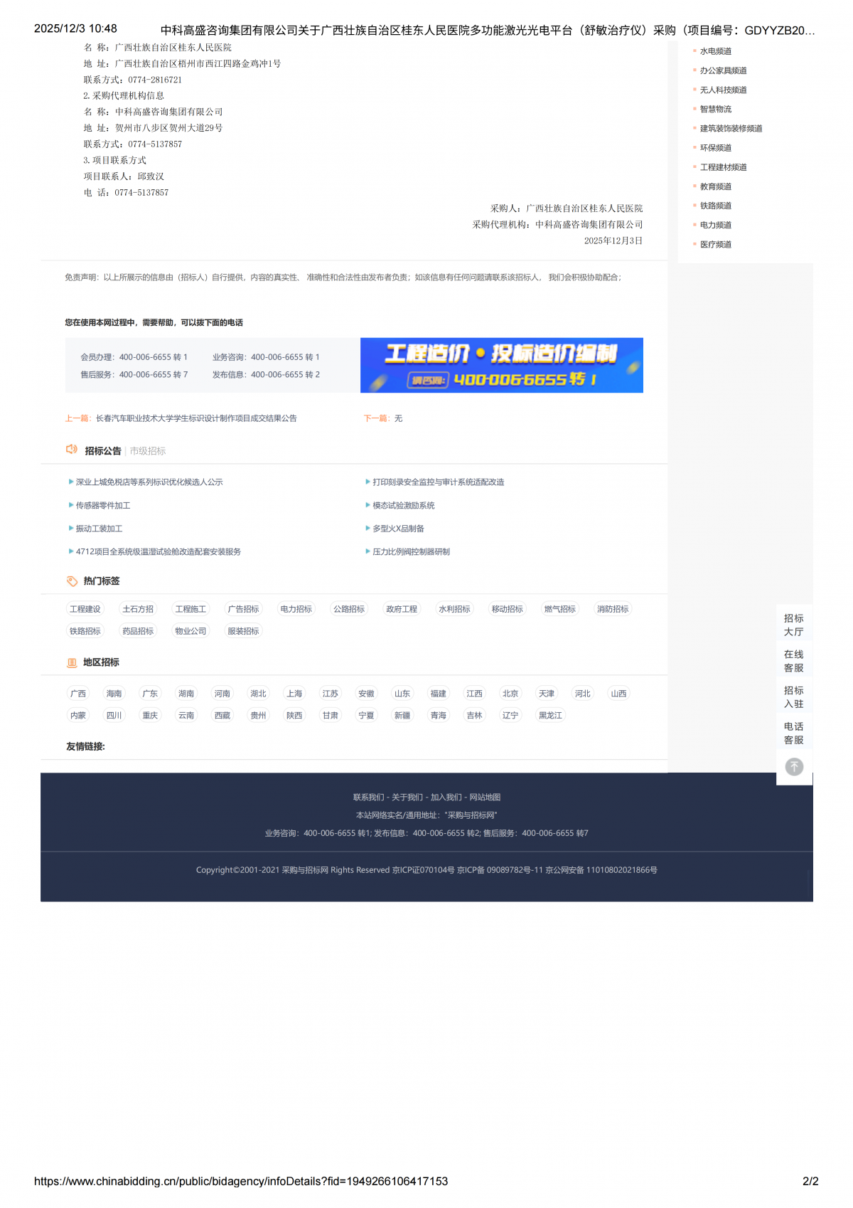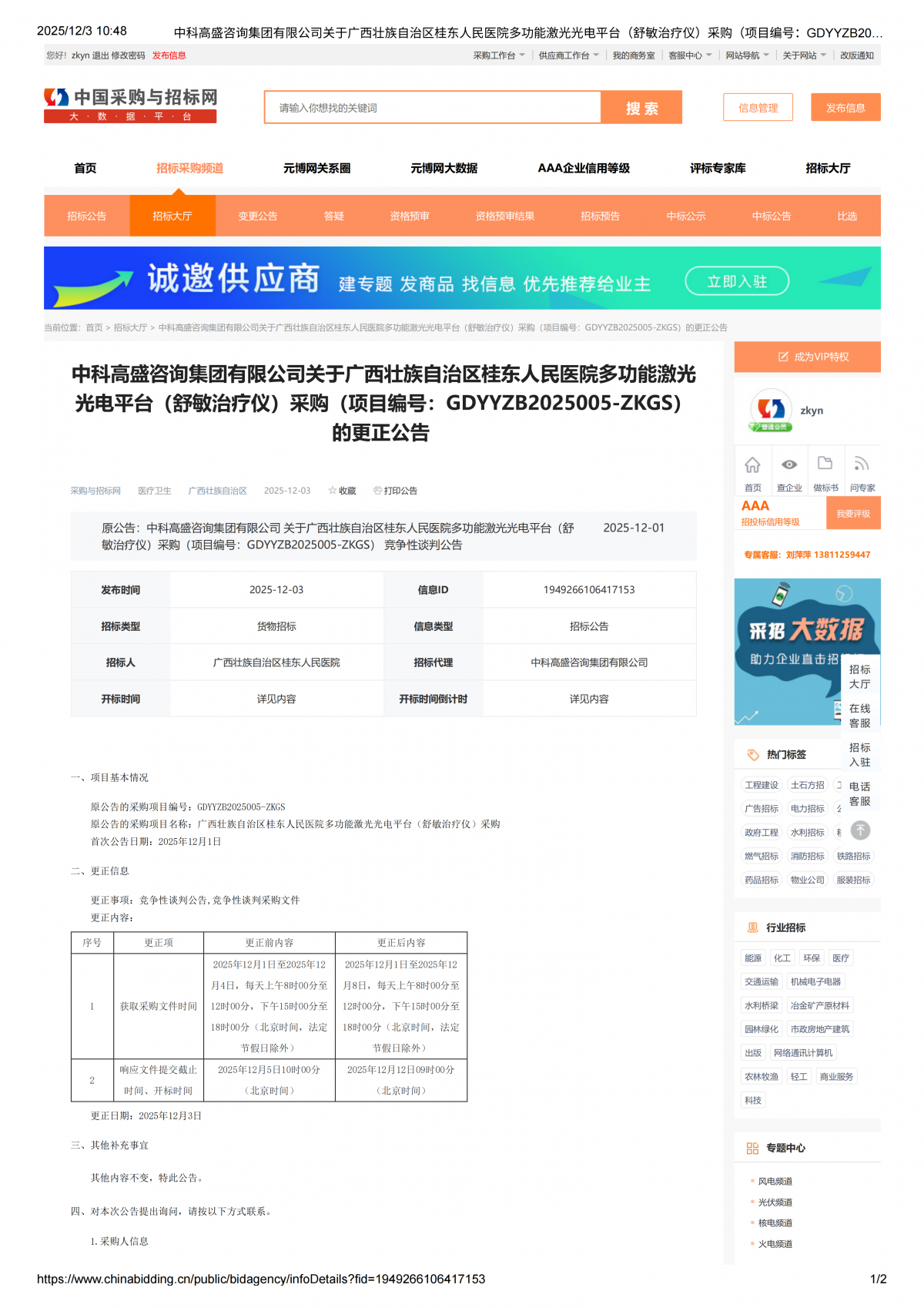 广西壮族自治区桂东人民医院多功能激光光电平台(舒敏治疗仪)采购项目更正公告