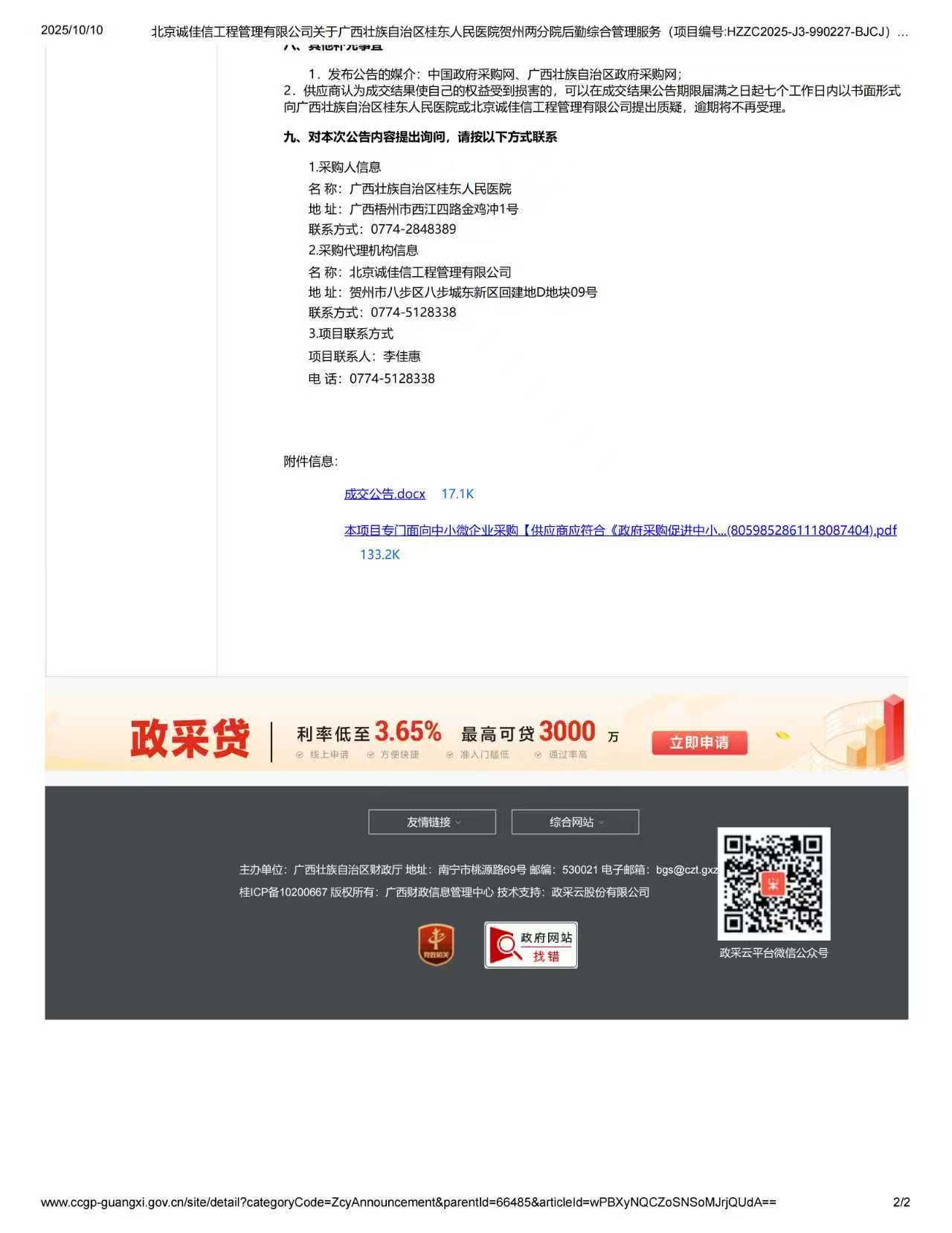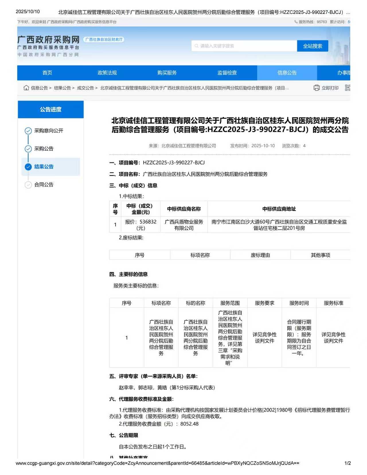 广西壮族自治区桂东人民医院贺州两分院后勤综合管理服务成交公告 发布时间:2025-10-10 17:50:28本文来源: 招标管理办公室 分享到: 如拟:http://www.ccgp-guangxi.gov.cn/site/detail?categoryCode=ZcyAnnouncement&parentId=66485&articleId=wPBXyNQCZoSNSoMJrjQUdA== (此链接无法直接点击跳转,请复制粘贴至浏览器打开) 扫一扫 手机端浏览