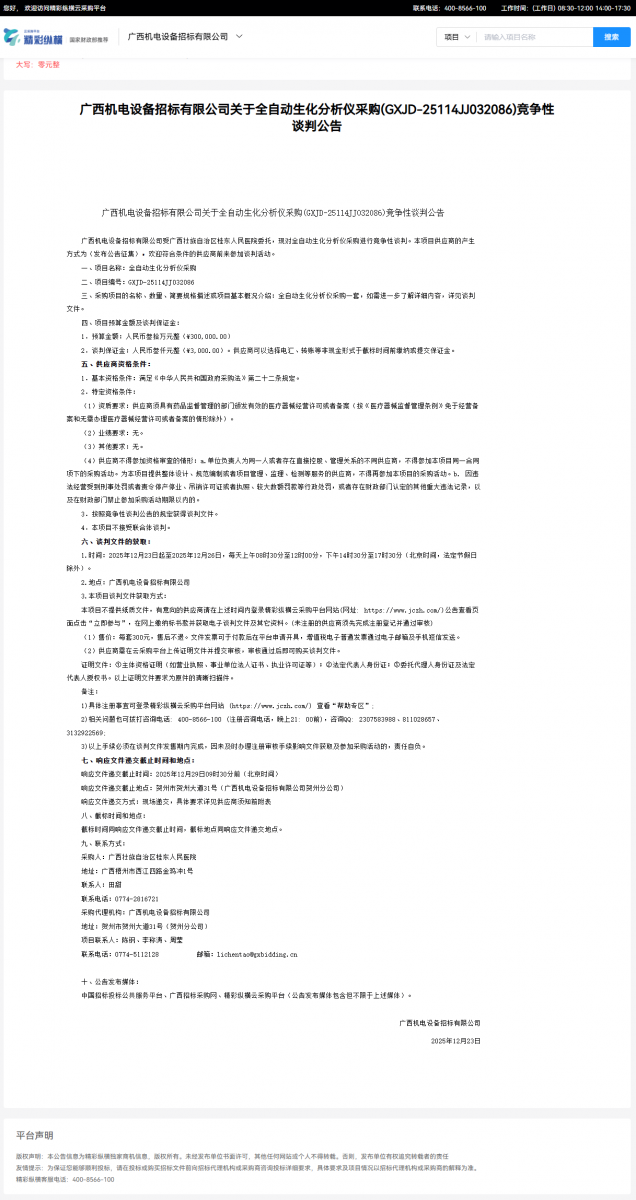广西壮族自治区桂东人民医院全自动生化分析仪采购竞争性谈判公告