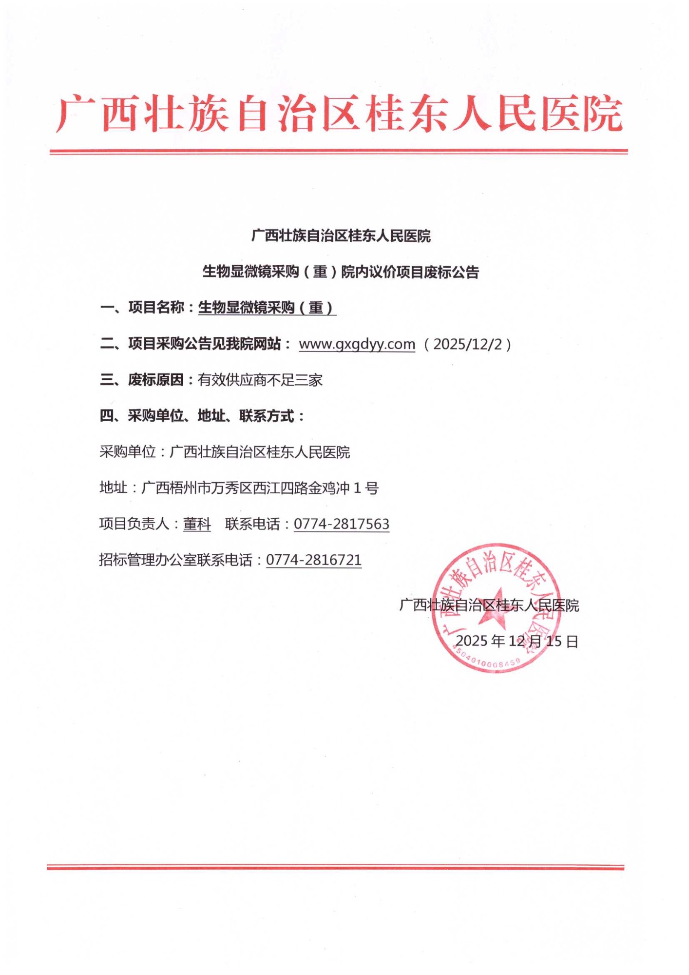 广西壮族自治区桂东人民医院生物显微镜采购(重)院内议价项目废标公告