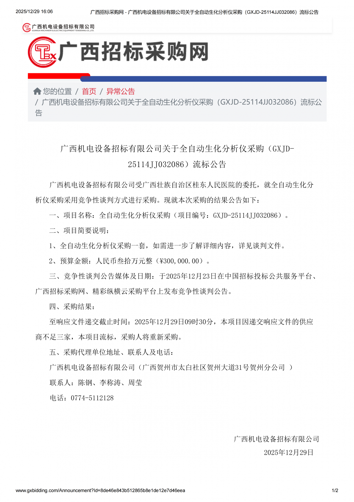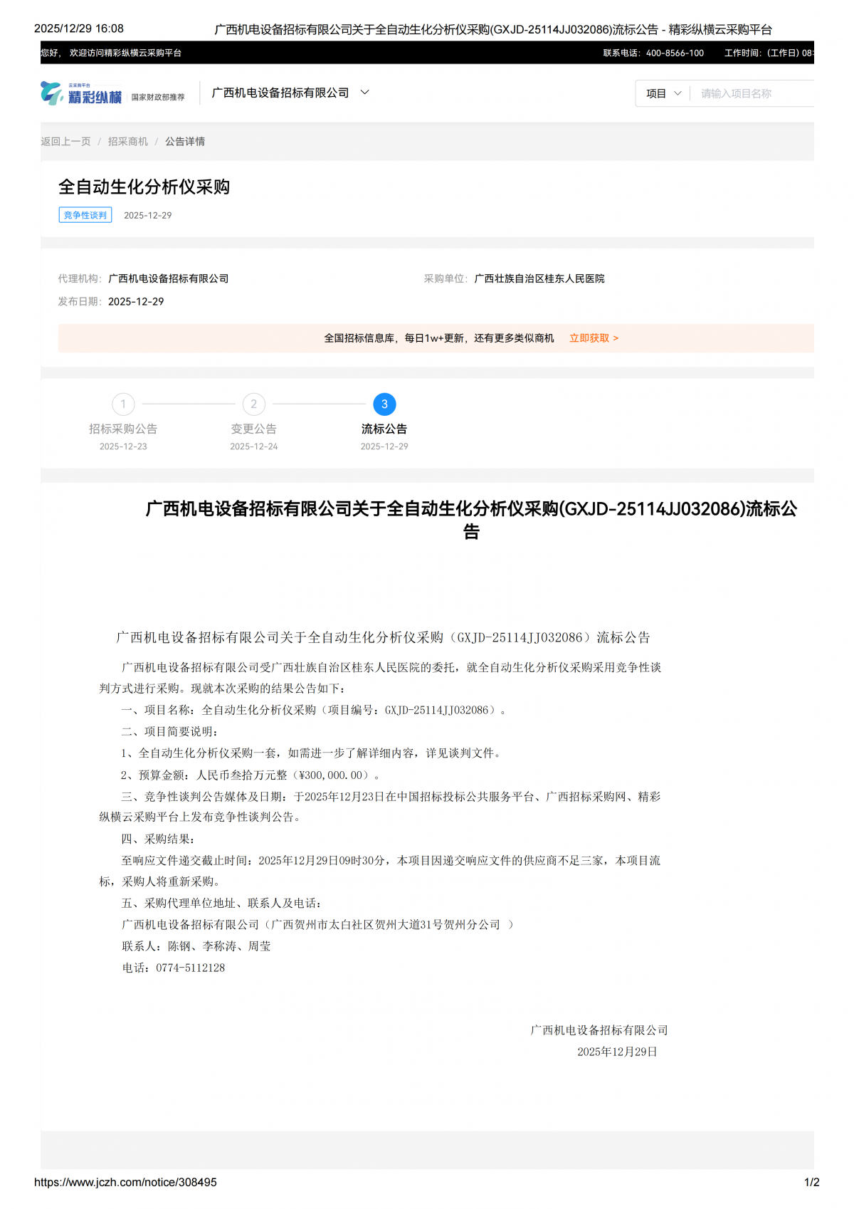 全自动生化分析仪采购流标公告