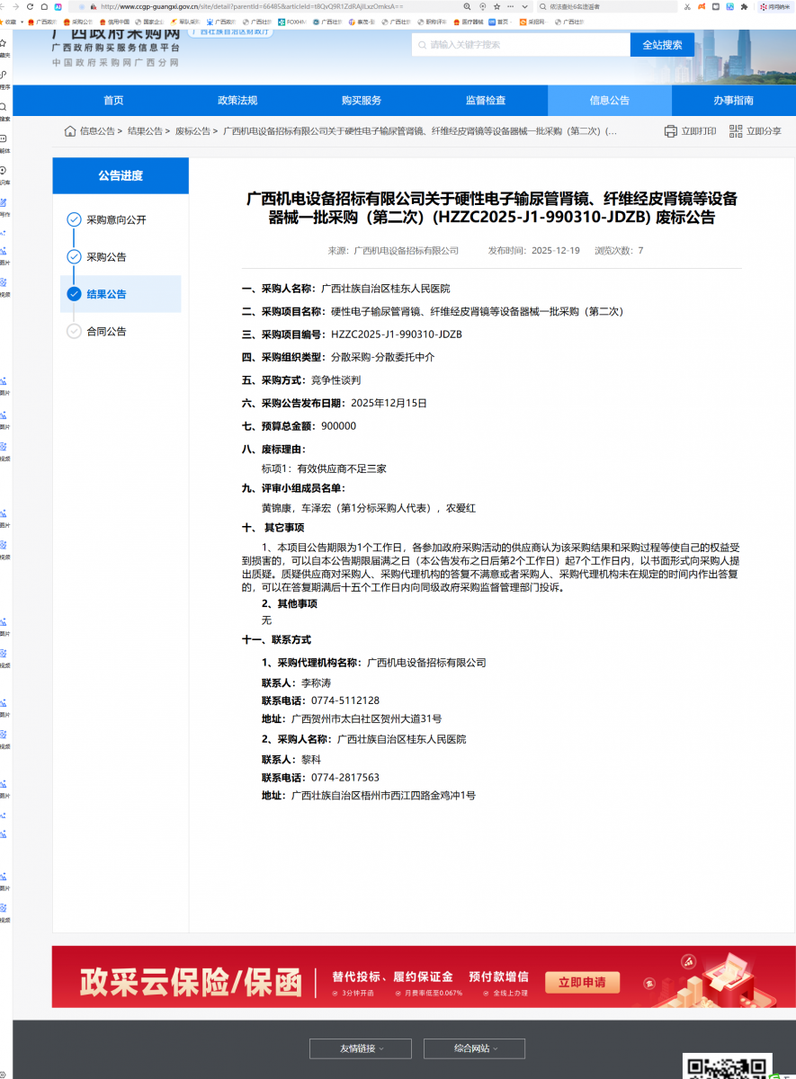 硬性电子输尿管肾镜、纤维经皮肾镜等设备器械一批采购(第二次) 废标公告