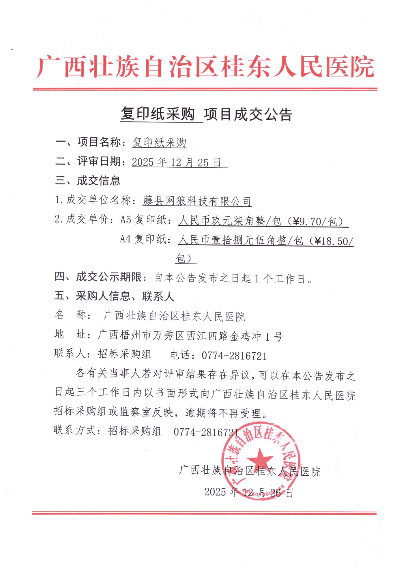 广西壮族自治区桂东人民医院复印纸采购成交公告