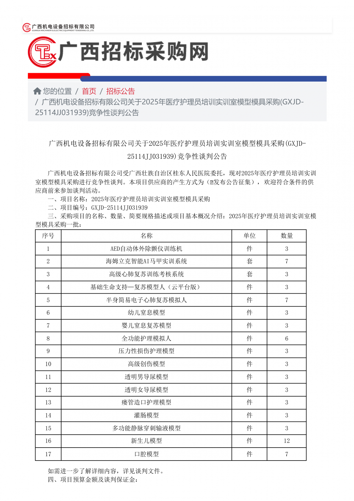 2025年医疗护理员培训实训室模型模具采购招标公告