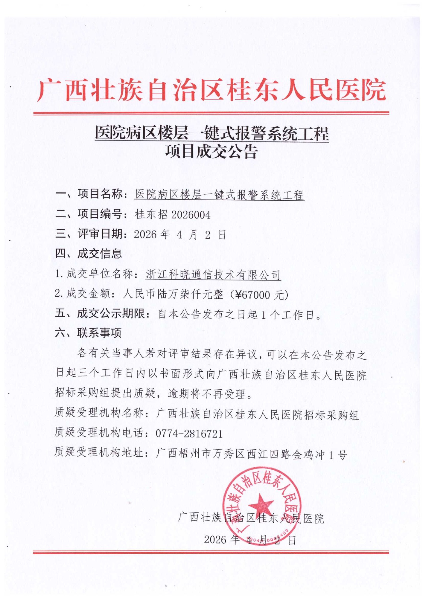 医院病区楼层一键式报警系统工程成交公告